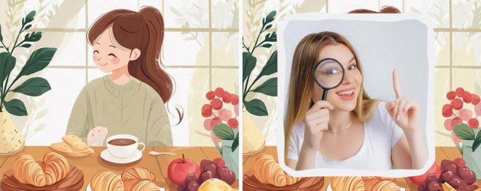 Nuotraukose užfiksuota miela mergaitė, besimėgaujanti pusryčiais virtuvėje. Ji geria kavą (arba arbatą) su skaniais kranais. O desertui ji turėtų suvalgyti fruiti. Vaizdai atrodo beveik identiški, tarp jų yra keturi subtilūs skirtumai. Ar sugebėsite juos rasti?