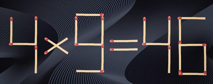 Taigi toliau matysite paveikslėlį, kuriame pavyzdys išdėstytas su degtukais. Jame teigiama, kad 4 padauginus iš 9 gaunamas atsakymas 46. Jūsų užduotis – šiame pavyzdyje perkelti tik du degtukus, kad jis taptų teisingas.