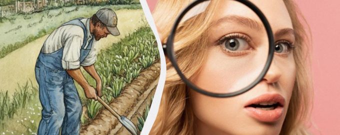 Iš karto pamatysite lauką netoli vaizdingo kaimo ir tris vyrus, dirbančius lauke. Jums reikia nustatyti, kas šiame paveikslėlyje yra negerai.