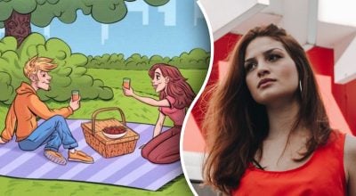 Paveikslėlyje matome vaikiną ir merginą, kurie atvyko į vaizdingą vietą iškylauti. Jie sėdi ant antklodės, patiestos ant žolės, o rankose laiko stiklines su gėrimais. Už jų matome vaikiną, žaidžiantį su dviem šunimis.